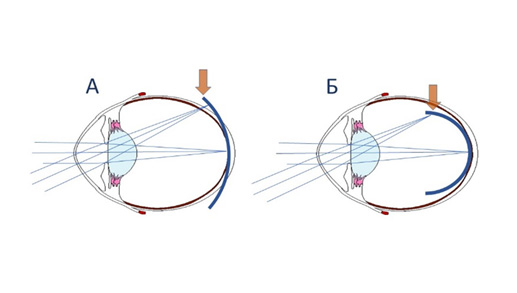 Рисунок. Периферический дефокус: коррекция миопии обычной сферической контактной линзой (А) и ортокератологической линзой (Б).